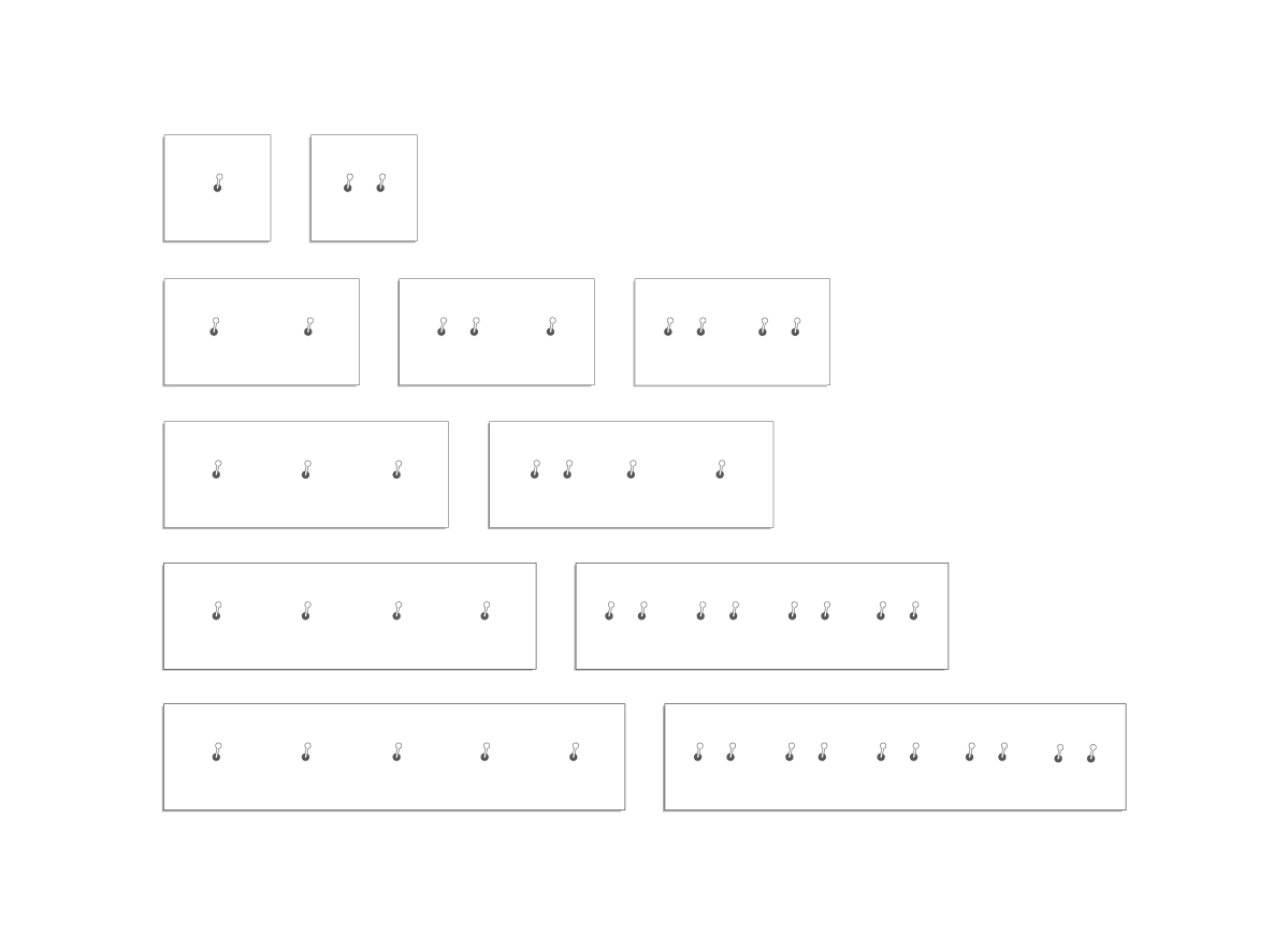 5 tailles de façades : simple 85 x 85 mm, double 85 x 156 mm, triple 85 x 227 mm, quadruple 85 x 298 mm, quintuple 85 x 369 mm. Utilisables verticalement ou horizontalement.