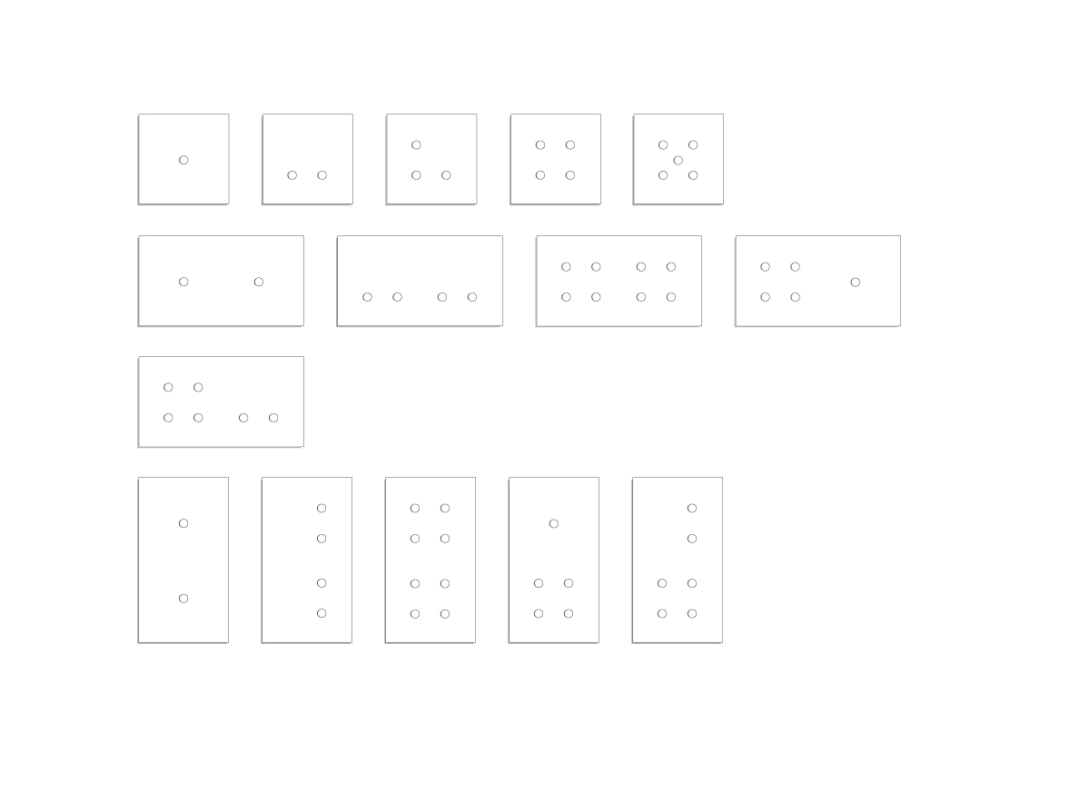 5 maten: single 85 x 85 mm, dubbel 85 x 156 mm, drievoudig 227 mm x 85, viervoudig 85 x 298 mm, vijfvoudig 85 x 369 mm. Verticaal of horizontaal gebruikt